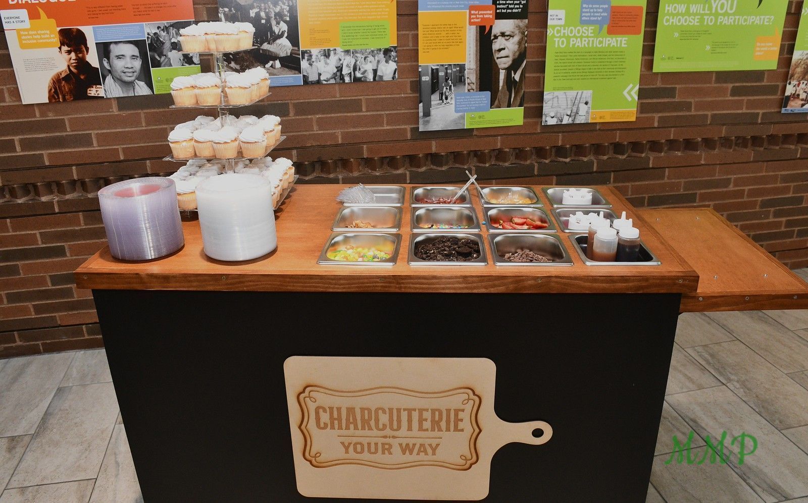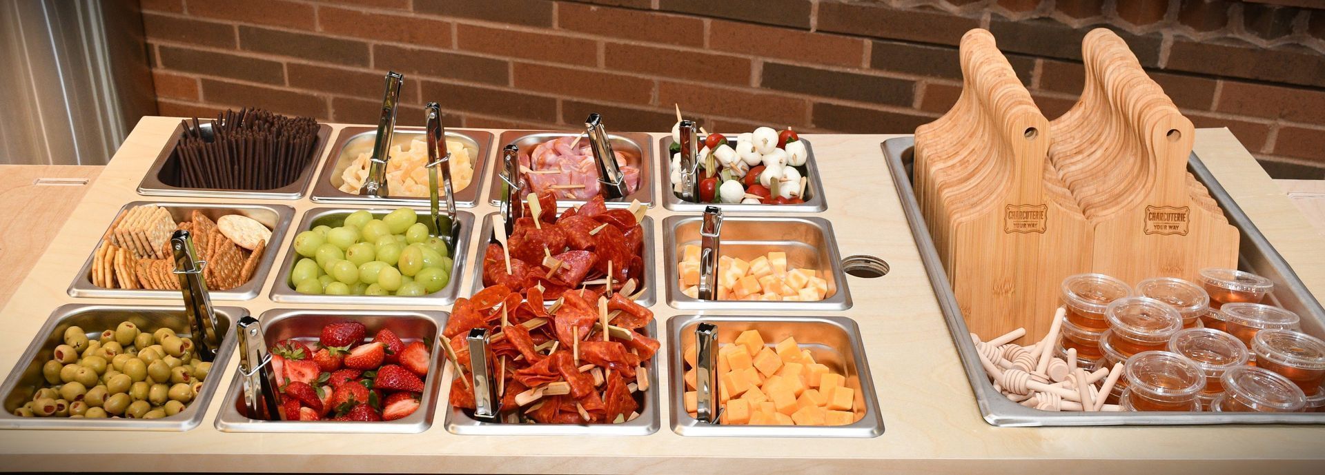 3 Cheeses (Cheddar, Colby Jack, Mozzarella Pearls (with or without tomatoes), 2 Meats (Salami and Pepperoni, Capicola, Mortadella) , 3 Fruits (Fresh Seasonal and Dried), 4 Accompaniments (Nuts, Crackers, Cornichon Pickles, Olives, Honey, Pretezels) . Disposable plates and napkins.